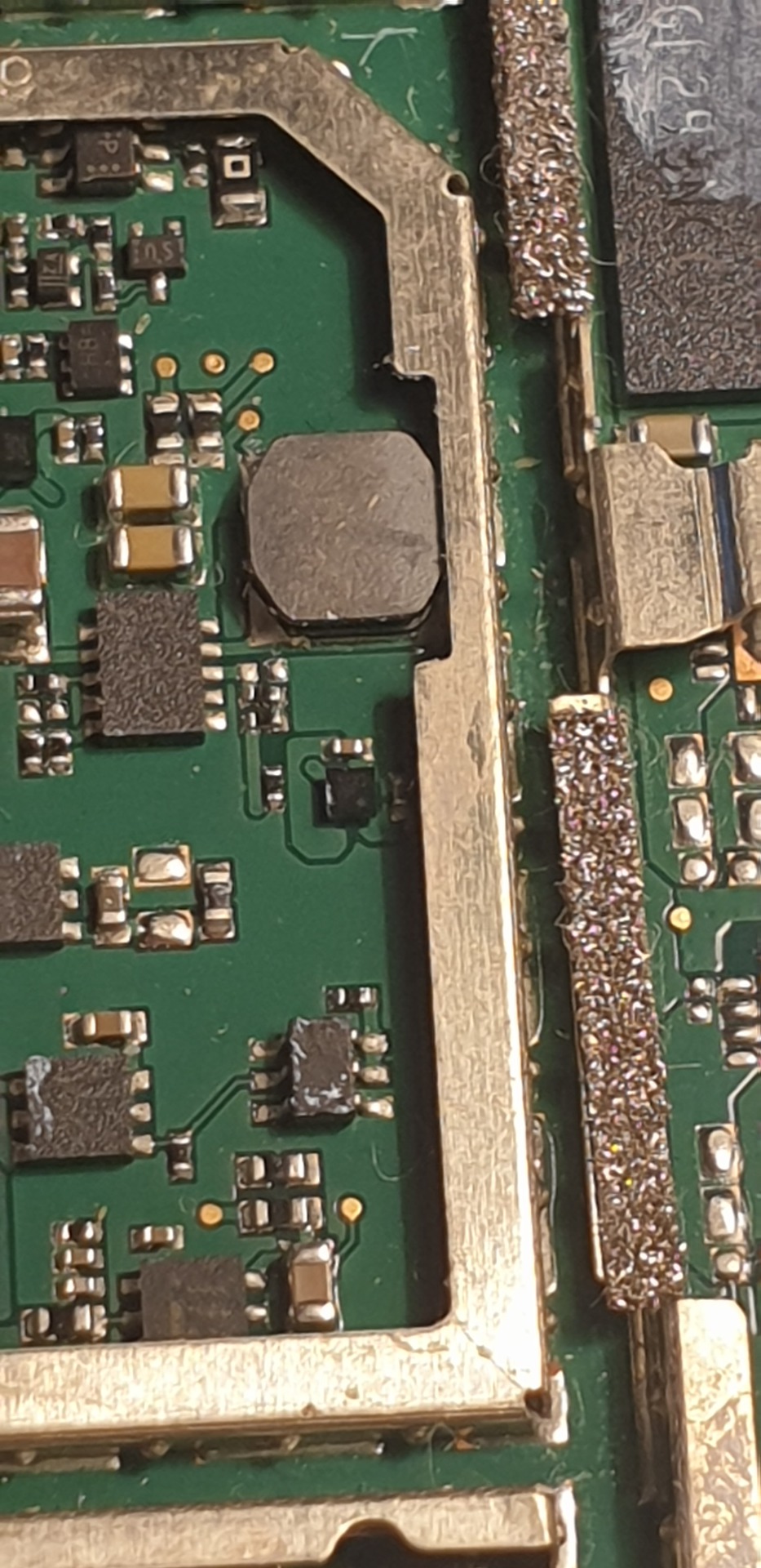 Én nem látok azon a vasmagos tekercsen semmilyen sérülést. Gyárilag le van törve annak mind a négy sarka. Ha el is lenne törve a vasmag, az nem okozna zárlatot.