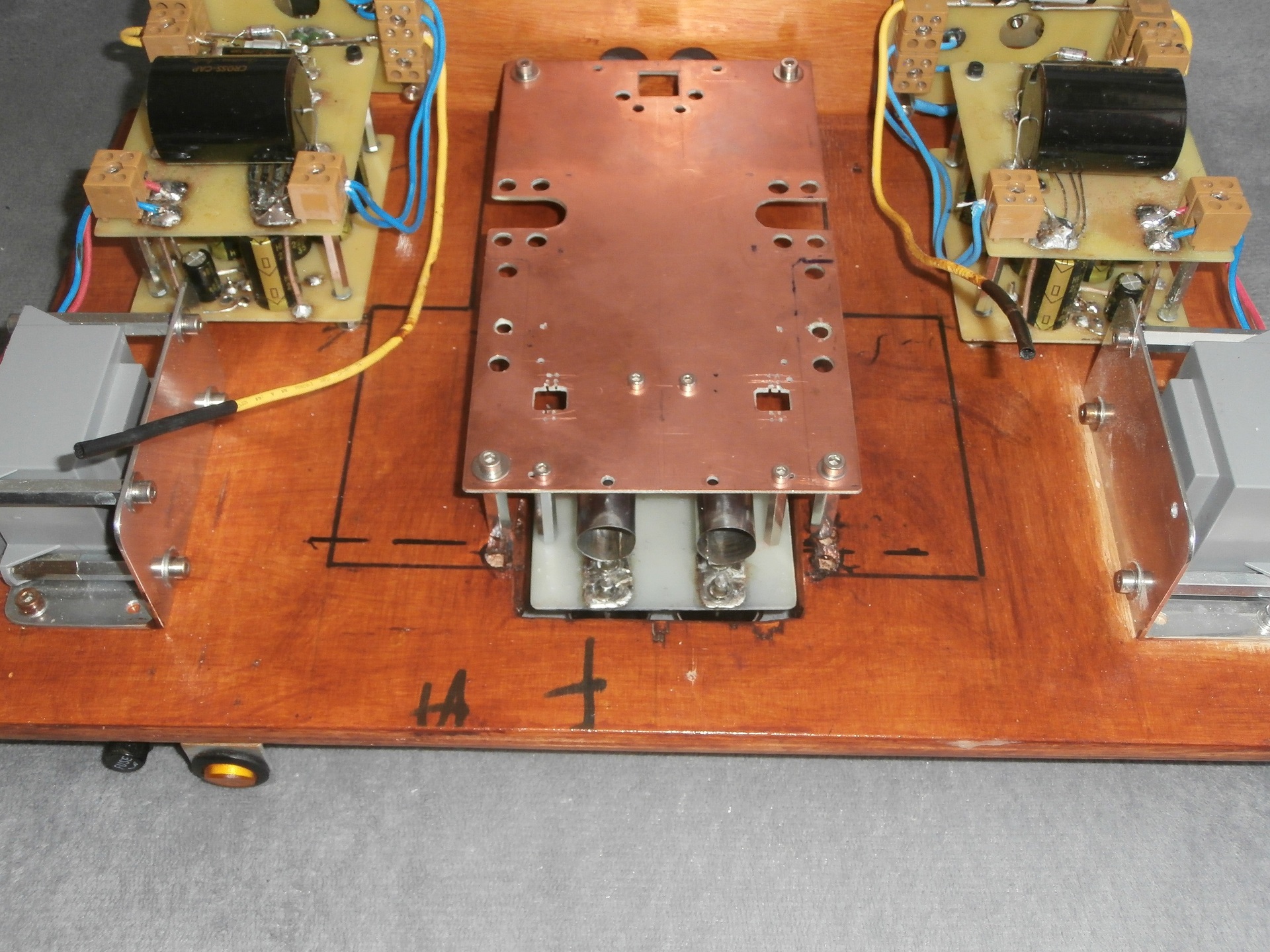 Amikor belekezdtem, még nem tudtam, hogy áll össze a kimeneti kapacitás. Ám közben, amikor összeállt, láthatóvá vált számomra, hogy igazából nincs hely a fóliakondiknak a kimenetnél. A leendő készülék alaplap méretét nem szívesen adnám fel, ezért megpróbálom ez alkatrészeket "pincébe" elhelyezni. Az biztosnak látszik, hogy a kimeneti csatlakozók a homloklap közelébe kerülnek a tervezett panelvég helyett. No meg az is, hogy a majdani készülékházban a jobb oldali hálózati trafó prímér kábelét szintén a homloklap felé, előre kell hoznom alul, mivel jelenleg a tervezett „lejáró” alá esik. Ez van, végül is ez csak egy próbafalap, ha le is van barnára pingálva. Az alul kilógó fóliakondikhoz egy teknőt kell majd építeni, hogy alulról ne tudjanak megsérülni. A tápok már megvannak, így jöhet az erősítőpanel. Az adódott, mért adatok 24 volt kimeneti feszültségre: 1K terheléssel a pufferfeszültség 30,xxV 180 ohmra 28,xx voltot mértem Azonban kedves mentorom ajánlata alapján a 3,6 elem a stab Gate-n stabil működést garantál. A pufferkondik 10, 20, és 30V-on lettek formázva 1K ellenállással.