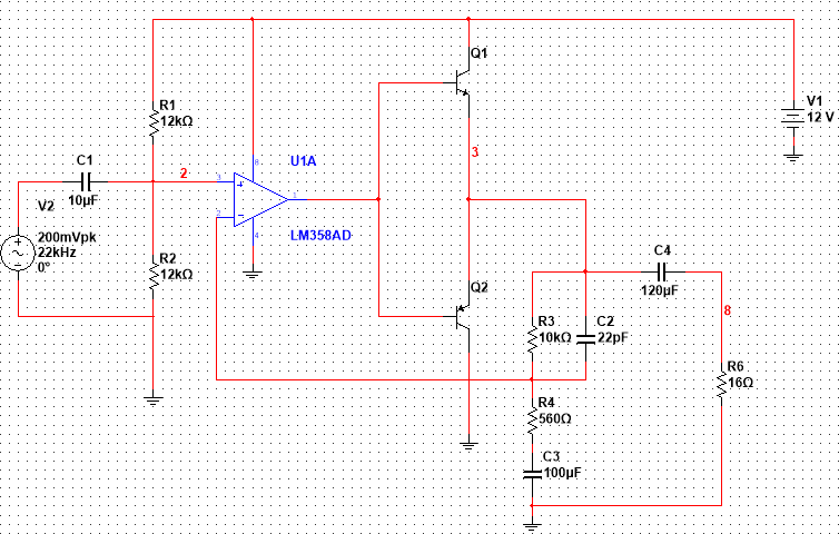 Egyik zenész barátom megkért, hogy tervezzek neki egy fejhallgató erősítőt. Elsősorban a meglévő alkatrészekből szeretnék dolgozni, ezért terveztem egyet LM358 as ME-vel. Egyenlőre csak Multisimben ügyködtem. Táplálást nem akarok szimetrikusat ha nem muszáj, mert így elég lenne egy hálózati adapter is. A problémám az, hogy ezzel a kimeneti fokkal nagyon nagy a keresztezési torzítás. Viszont ha beteszek diófákat és ellenállásokat, ahogy kell, akkor stabil 0V van a kimeneten. Tudnátok valamit tanácsolni, kiegészíteni a tudásomat?
