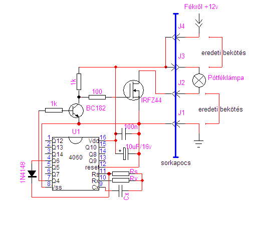 Barátom akkoriban felszerelt egy pótféklámpát és a rendőr kérdőre vonta, jelezve, hogy annak nem szabad ott világítania. Ekkor a haver előkapott a kesztyűtartóból egy nagy kést, mire a rendőr visszahőkölve ijedten kérdezte, hogy MAGA MEG MIT AKAR AZZAL A KÉSSEL??!!. Erre magától értetődően felelte: - Hát levágom a vezetékeket! )Naszóval tetszik a design, ezért én is kitaláltam egy áramkört az előbb, még nem próbáltam ki, de előzetesben felteszem, kíváncsi vagyok mit szóltok hozzá. Ha lesz időm, akkor a hétvégén ki is próbálom, szerintem elvileg működik! |