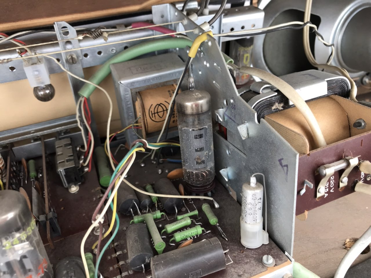 Egy tekerő hiányzik. Zúg, tehát az erősítő ok, de a rádiója nem szól. Csöveket kocogtatva recseg. Középhullámot próbáltam csak. EF89 mintha nem fűtene, EABC is féloldalasnak tűnik. Tovább nem kínoztam. Varázsszem nagyon szépen fénylik, mintha új lenne. Nem sok óra lehet benne. Ha nem gond, nem szeretném 1 hét múlva a jófogáson látni. Borsodi Mestert szeretem.