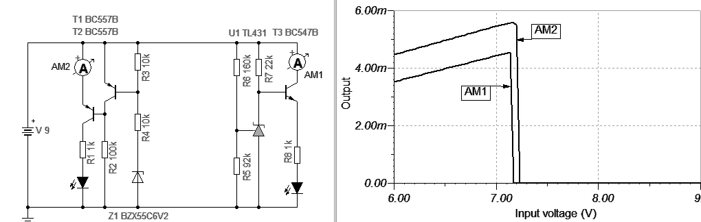 Másik megoldás a javasolt mikrófogyasztású OPA és kb. 50uA-es Band Gap dióda referenciának. Egy BC záróirányú B-E dióda is működhet zénerként. Annak áram lehet kicsi, de könyökértéke esetleges szokott lenni, tehát azt válogatni kellene. Azzal és egy NFET-el megint lehet kis önfogyasztású eszközt készíteni (mint az első ábra), de nem biztos hogy a 7V megoldható.
