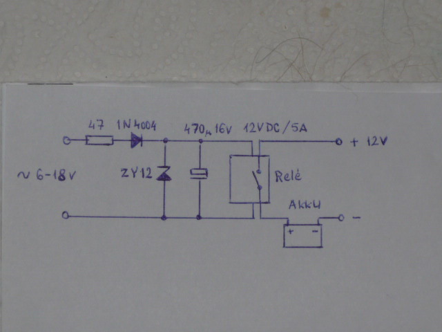 Most értem haza, de azért még ma felteszem a rajzot. A lényeg hogy a bemenetet a generátor kapcsaira kell kötni, ugyanoda mint a fesszabályzót. A többit majd holnap.