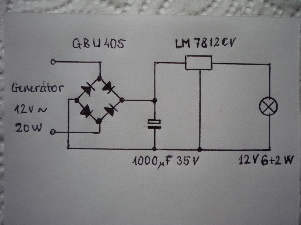 Annyit kell tudni a kapcsolásról hogy csak világításra való, 6W-os ledes bilux izzóval, meg hátra 2W-os izzóval működik tökéletesen. A generátor teljesítménye max 20W lehet. A fénye erősebb, mint a 35W-os halogén égőjé. A ledes reflektor izzó ilyen:
