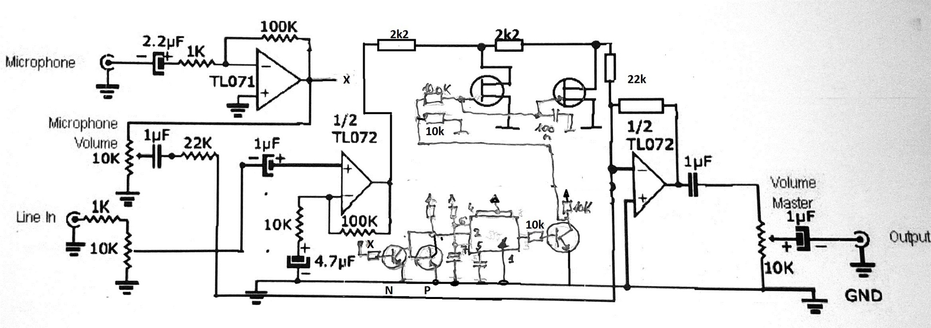 A FET-es rajz jo lenne, ha N-MOSFET-et hasznalnal (azaz ne BF 245 N-ch J-FET-et), olyant aminek alacsony a GS threshold es R on erteke, pl DIODES DMN2050L Ez azt jelentene, hogy a 2k2 munkaellenallas es 775mV bemeneti audio jelszint mellett kb 35uV lenne a kimeneti szint amihez elegendo 2V vezelo jel.