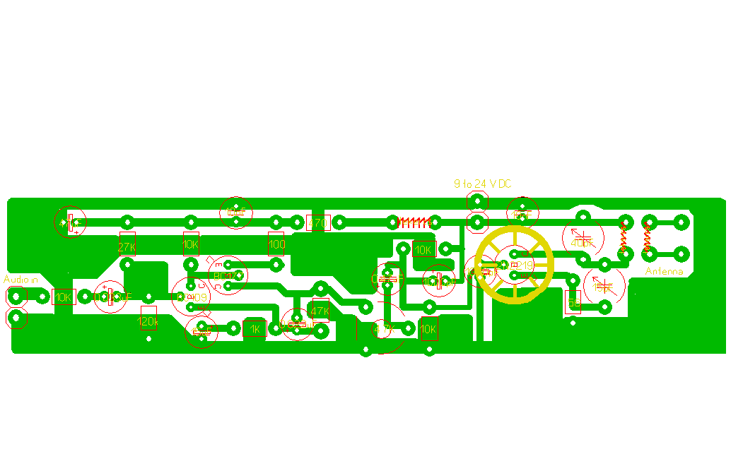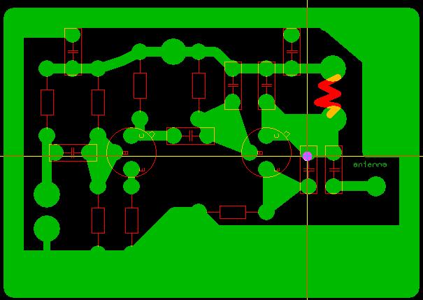 A 2N2219 környékén a vezetékekből a töréseket mindenképpen kivenném, ezen a frekvencián szerencsésebb egyenes vonalakkal vezetékezni. Ha lehet, akkor még inkább kis szigeteket, foltokat alakítanék ki. A betáplálási pont mellé mindenképpen tennék egy kerámiakondit, pártíz, vagy 1-2 száz nF értékben.
