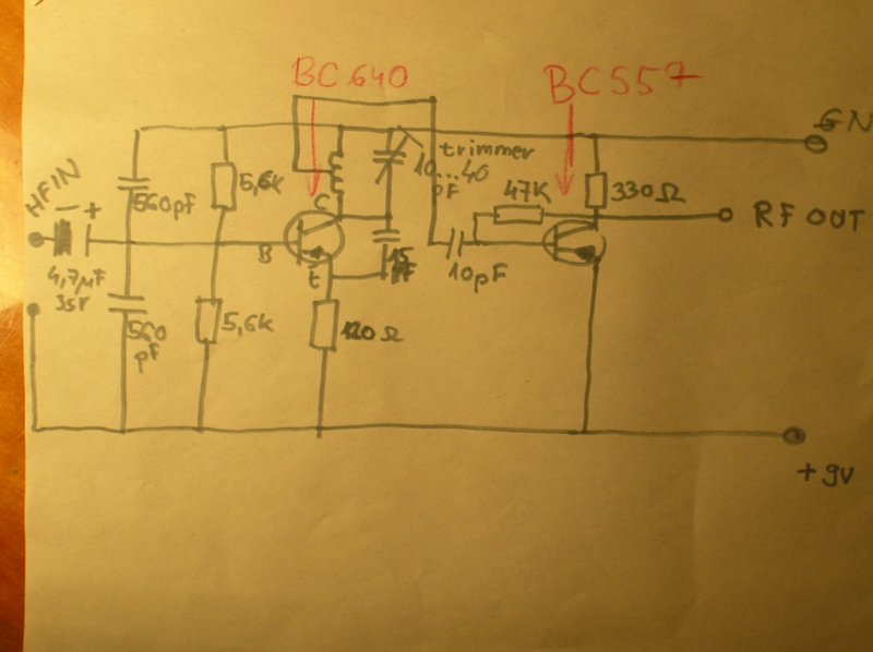 Ez az általam elkészített és műkődő kapcsolás, amit már két éve használok. Az első fokozatban, BC640-es tranya helyett nyugodtan használj BC 547-et, mint a második tranyánál ![]() Ez a kapcsi azért jobb egy egyszerű egytranyosnál, mert egyrészt, ha 12V-ról járatod (akkumulátor!!), akkor akár 100mW kimenője is lehet, és stabilabb lesz a frekvenciád, mert az antenna nem közvetlenül az oszci tekercséről csatolódik, hanem egy külön fokozatról csatolod ki. üdv