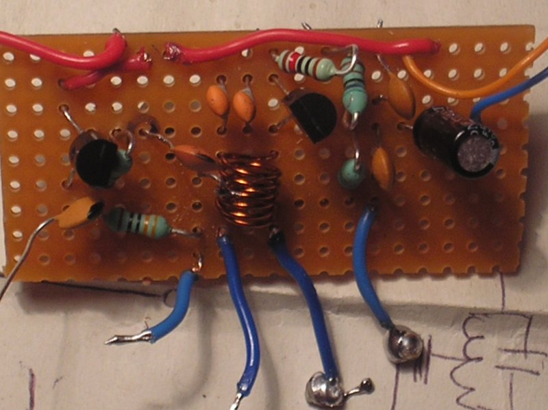 A BC547- s BC557-s közül mindkettő hangfrekvenciás tranzisztor, de simán elketyeg 100 MHz-s sávban is, szerintem helyettesíthető egyik a másikkal. Ennek ellenére én nem ajánlom, hogy másik tranyót használj, mint ami bevált és a rajzon fel van tüntetve (nagyon sokat kibírtak ezek a tranyok több órás üzemet melegedést 12 V-os fesz mellett). Itt egy fénykép az adorol is, bár ez azóta át lett jócskán építve a drót összeköttetéseket megszüntettem, és az ellenállásokat fekteve helyeztem el, de a hátfényképről ezen is láthatod hogy hogy gondoltam, hogy egy tömbbe forraszd össze az azonos helyen lévő alkatrészlábakat.