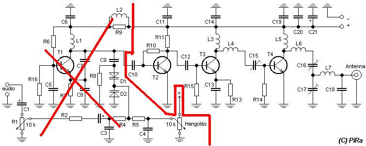 Rákötöttem a vezeték darabot a transzmiterre és a hatótávom 100 méter körül alakul (hézagosan) de ez kevésnek bizonyul.Ezt a 4 W adót akarom használni erősitőnek ha leválasztom az elejét és c10-re kötöm az antena jelet ugy jól fog müködni?Meg növeli a hatótávomat?A válaszokat előre is köszönöm!