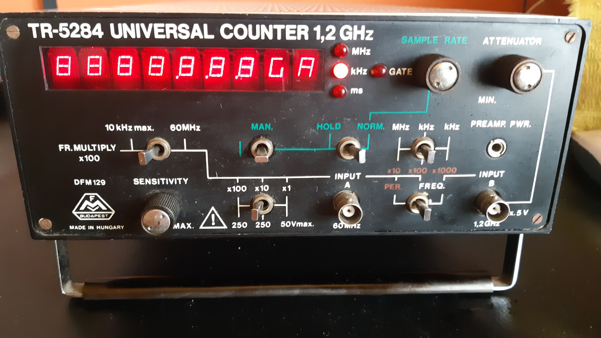 Van egy FMV TR-5284 (1.2GHz) frekvenciamérő, számláló a birtokomban. A készülék azt követően romlott el, hogy 10 évig állt egy dohos helyiségben, mindenféle használat nélkül, még az előző tulajdonosánál. Hibajelenség: Bekapcsolás után a kijelző 8888.8.8.8GA (ez a "GA" valószínűleg szegmens hiba, és talán szintén 88 szeretne lenni). Sajnos semmilyen kezelőszervre nem reagál, a hátsó kapcsolók állásának változtatására sem. Egy apró életjel van, ha a bemenetet átkapcsolom 60MHz-ről (Input A) 1.2GHz-re (Input B), akkor felkapcsol még egy tizedespontot a kijelzőn, tehát 8888.8.8.8.GA jelenik meg. Először a tápkörre, és annak kondenzátoraira gyanakodtam, de sajnos minden táp kimeneten rendben vannak a feszültségek. Mit javasoltok, hogyan tovább? A hibakeresést kissé megnehezíti, hogy csak és kizárólag hétvégén vagyok a készülék közelében, így tanácsaitokat csak egy hét elteltével tudom majd követni. Amire gondoltam, hogy a tápegység látszólagos működőképességétől függetlenül ki fogom cserélni a készülék összes (mérőpanelen is fellelhető) elektrolit kondenzátorát. Mit gondoltok erről a lépésről? Hamarosan mellékelni fogok két képet, kérem, ellenőrizzétek le nekem, hogy minden szükséges panel benne van-e? Köszönettel: Attila