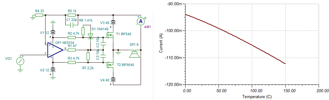 A hőre megfutást 100 W-hoz méretezett hűtőborda esetén nem érzem veszélyesnek. A szimulátor szerint a 25°C-on 100 mA, 130°C-on emelkedik 200 mA-re, ami még kezelhető érték. A bordától elvárhatjuk, hogy 20 W tartós terhelés ne melegítse 70°C fölé, ez a ±40 V tápnál 250 mA.