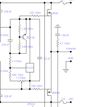 Az áramkörszimulátor nem kalkulál a hőellenállásokkal a borda anyagában, a tokozás és a borda között, meg a chip és a hűtőfül között. Nyugodjál meg, hogy 70C-os bordahőmérséklet mellett ha odadurrantasz a FET disszipációjával, vastagabb a csillám, stb, akkor lazán átmehet a chip hőmérséklet 130C° fölé... Egy kb 8mV/C° termikus kompenzáció kell a fetek mellé... Az az 1 diódás valami nem fogja ezt megoldani korrektül. Javaslom a VF2-ben is alkalmazott megoldásomat a TL431-el. Az itt is ugyanúgy használható, csak át kell méretezni... Vagy lehet csinálni egy db TL431-el egy megfelelő hőfokfüggésű és kapocsfeszültségű kétpólust, pl így: Vagy felragasztgatsz 4 diódát... A hozzászólás módosítva: Jún 14, 2020