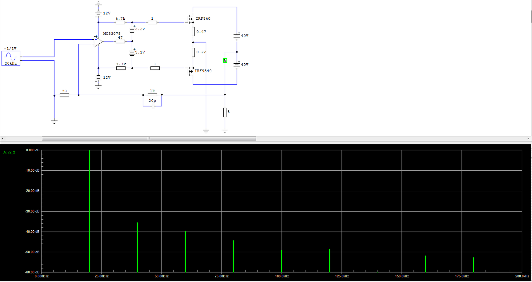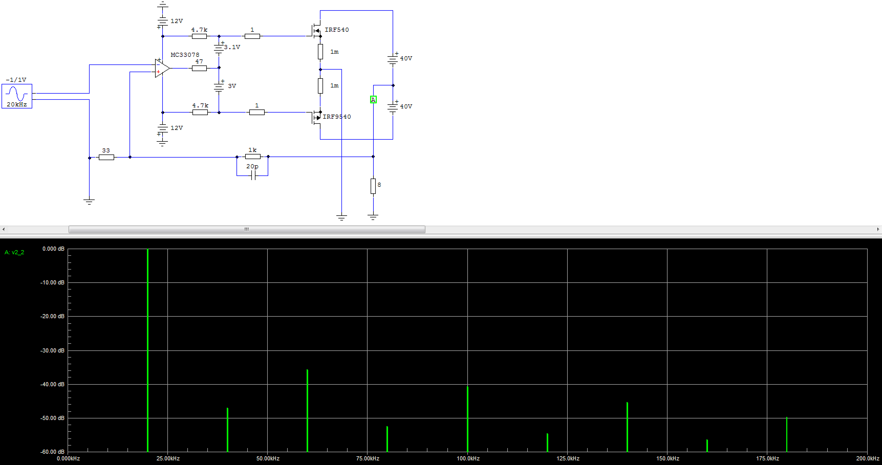 Azt eddig titkoltam, hogy 100mA volt a nyugalmi áram. A Tina szerint a nálad jelölt UGS-sel határozottan zárva vannak az IRF-ek és jelentős keresztezési torzításra lehet számítani.