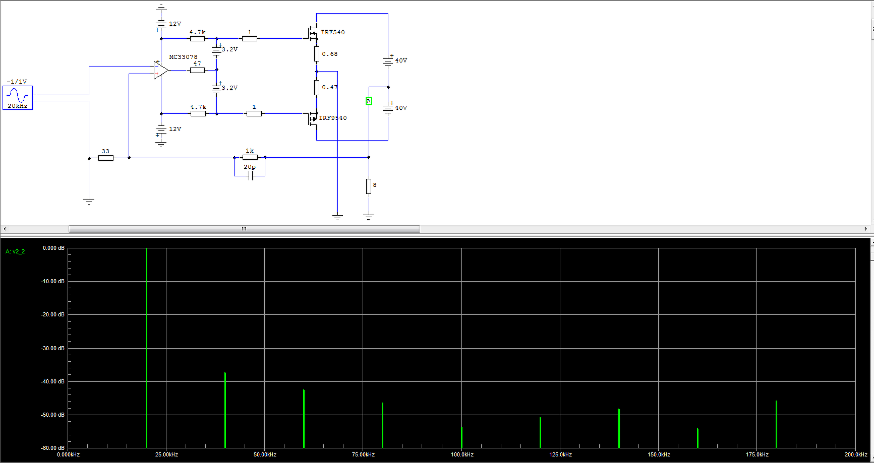 Mivel 5534-em nincs, ezért 33078-al teszteltem. Vélhetően az 5534 nagyobb kimenő árama jobb eredményt mutatna, de ez van. Az első ábrán nincs source ellenállás, vagyis 1mOhm az áram méréséhez beiktatva. A másik két esetben van. A gate előfeszítését igyekeztem úgy állítani, hogy 100mA nyugalmi maradjon minden esetben. A harmonikusok -40dB körül vannak, de az alapjel +30dB, így az 70dB-t jelent. Ez 0,03% körül van saccra. ha jól láttam 20kHz-en szimuláltál, és 1V bemenő jellel. Ha nem jól láttam, akkor jelezd és én is módosítok.