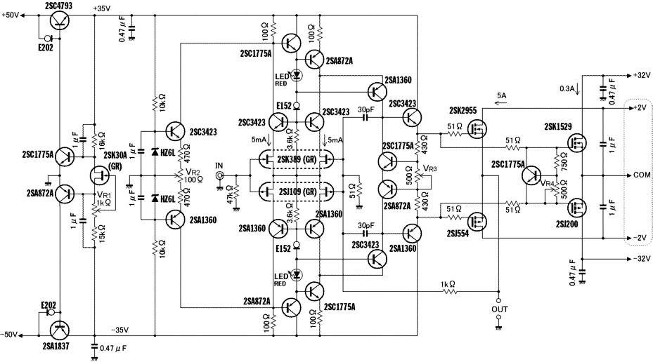 "Földelt kimenetű", tápfeszültség utánhúzott, hasonló mosfetekkel ( 2SJ554, 2SK2955 ):