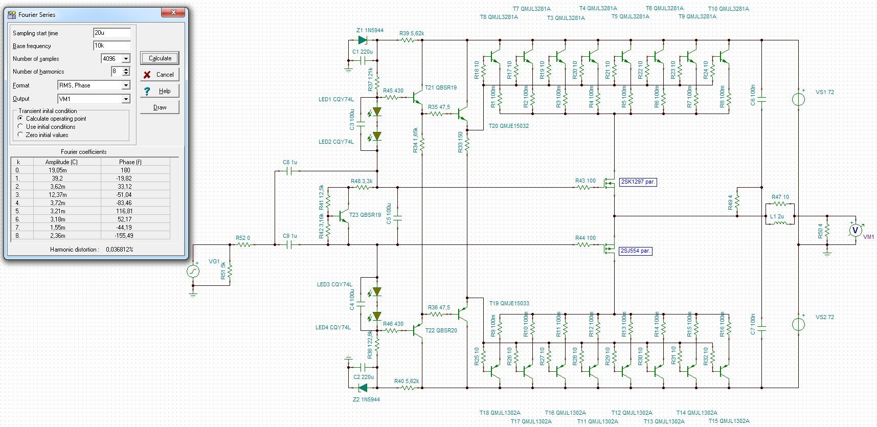 Ennek az Asahinak vannak érdekes kapcsolásai. Jó, hogy kitetted ezt a rajzot mert nem találtam a honlap linkjét. Ez a kapcsolás nem földelt kimenetű, "csak" tápfeszültség utánhúzott, de szellemes. Bár valamelyik Rádiótechnika évkönyvben leközöltek már hasonló kapcsolást (talán Sípos Gyula). Ma már azt gondolom, nincs értelme "A" osztályban járatni a laterális feteket. Azt is gondolom, hogy ezek az Exicon fetek nagyon jók és továbbra is ezekkel fogok építkezni (ha fogok... még nem tudom). Időközben kipróbáltam, hogy fülre a 100mA-es nyugalmi áram beállítás a "legjobb hangú". 50mA-nél érdes lesz a hangja, 200-nál meg van benne valami furcsa. Talán a dinamikája vész el, vagy csattogós hangja lesz... nem tudom, de nem jó sem a nagyobb, sem a kisebb áramú beállítás. Ott kell használni amire ki van találva, a hőmérsékletfüggetlen munkapontban. Továbbra sem fogok átfogó negatív visszacsatolást alkalmazni és szerintem megmaradok a "fetgörbítőnél"... bár talánesetleg ezt az IC-s meghajtást még érdemes lenne kipróbálni... nem tudom. És ha földelt kimenetű (plusz lebegőtápos), akkor ki kellene használni a földelt kimenet azon tulajdonságát, hogy elmaradhat a VAS fokozat. És nem ártana, ha nem lenne nagyon elbonyolítva... de ahogy magamat ismerem... De most csak hangosan gondolkoztam a semmin. Idézet: Valóban nem pont olyan, ezért is az idézőjel.„Ez a kapcsolás nem földelt kimenetű, "csak" tápfeszültség utánhúzott...” Még nem láttam igazán hifis vagy highend indíttatású, és nem csak hangosítási célra szánt földelt kimenetű? erősítőt...Talán a Hafler 9505 erősítőkkel kapcsolatban olvastam, hogy vannak hifista rajongói is. Véletlenül ez is laterális mosfeteket ( 2SJ162/2SK1058 ) tartalmaz: http://tolisdiy.com/2020/10/08/hafler-9505-9300-power-amplifiers-re...ments/ Idézet: Hogyan kell ezt elképzelni?„És ha földelt kimenetű (plusz lebegőtápos), akkor ki kellene használni a földelt kimenet azon tulajdonságát, hogy elmaradhat a VAS fokozat.” Átfogó visszacsatolás nélküli erősítő többféleképp is elképzelhető, egyik megoldás szerint nincs a kimenetről induló visszacsatolás. Ebben az irányban próbálkoztam régebben már ( a darTZeel is ilyen ), az említett Denon féle áramkör módosításával. Ugye itt a lényeg az egyetlen, nagy meredekségű mosfet-pár alkalmazása, amellyel akár egészen nagy kimenőteljesítményt, alacsony impedanciás/nehéz terhelés meghajtás képességét ( a 4. ábrán 1500W/1Ohm/10kHz ) lehet elérni. A fokozat bemeneti kapacitása pedig jóval kisebb mint akár csak 1 pár laterális teljesítmény mosfeté ( Zbe jelen esetben 20kHz alatt gyakorlatilag rezisztív 60kOhm ) A hozzászólás módosítva: Szept 2, 2025