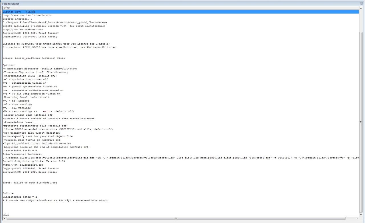 Ezt a hiba üzenetet csatolja, pedig most a Flow futtatása rendszergazdaként program mentése c:// programfiles/flowcode/v5/ tehát teljesen a gyökérbe... ![]() Viszont most annyiban volt másabb hogy forditás előt lefuttatta a kulcsellenőrzőt, nem tudom ennek van e jelentősége illetve létrehozott a Flowcode1 fájlra (ugyan az amit előzőekben csatoltam ) az msg és a c fájlon felül egy flowcode 1.fcf.001 fájlt