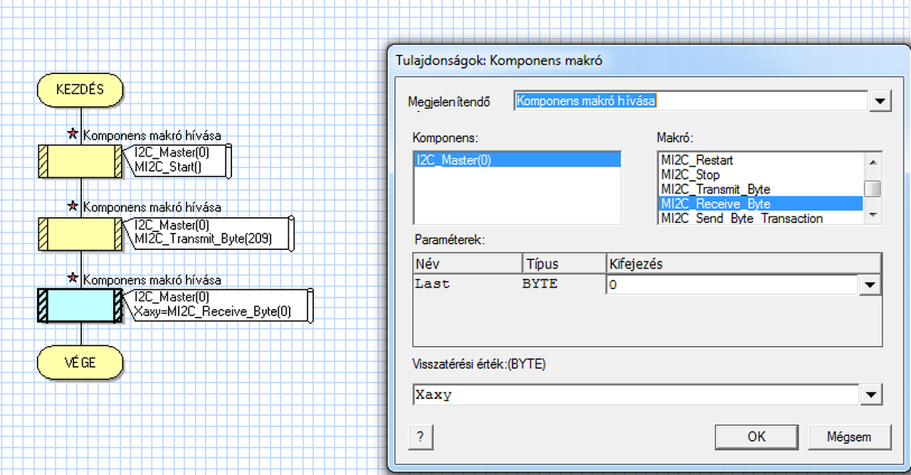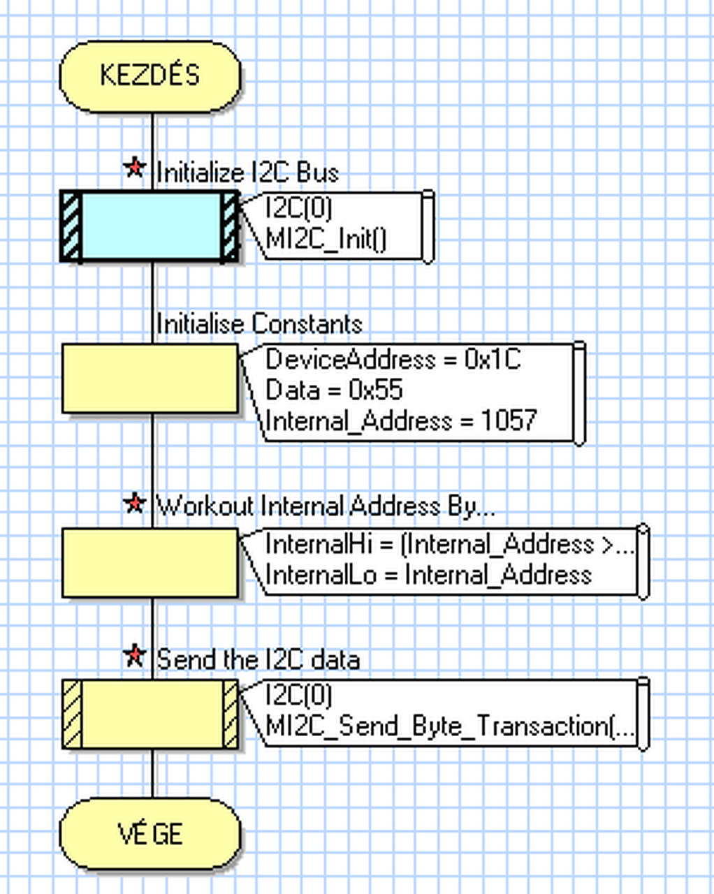 De hogy őszinte legyek nem értem... mármint magát a metódust értem, csak azt nem ahogy a Flow használja! Vegyük elsőnek a "Küldést".... leszedtem a példaprogramot Ezt az egész litániát be kell irni minden adatküldés elött? vagy csak egyszer a program elején és utánna amikor küldeni akarok akkor már csak a Send the I2C data részt kell? Ugy kezd a makró hogy iniciálás I2C(0) MI2C_Init() (Én mondjuk itt simán a startot választottam volna! Ő miért az Init-el kezd? amikor nem is ad értéket Utánna: Initialise Constants DeviceAddress = 0x1C Data = 0x55 Internal_Address = 1057 ( Itt a Változóknak adja meg az értéket a DeviceAddress gondolom a cimzett I2C ezköz címe A Data itt gondolom megadja a küldeni kívánt adatot, Az Internal_Adress pedig egy belső cim... amit nem értek, de erre mindenhol ezt látom) Utánna folytatja hogy Workout Internal Address Byte Values InternalHi = (Internal_Address >> 8) InternalLo = Internal_Address (Ezt Szintén nem értem, de erre is mindenhol ezt irja) Utánna pedig maga a küldés Send the I2C data MI2C_Send_Byte_Transaction DEVICE_ID ( Gondolom a cimzett I2C-t kell kiválasztani) AddrH AddrL (Ezeket valami kötelező protokolnak gondolom, mert mindenhol ez szerepel) Data (Pedig a küldendő adat... ha jol gondolom) Namost ... !!!! Mi a Különbség a MI2C_Transmit_Byte és a fent leirt Sent_Byte_Transaction között? Mert ha jol látom akkor a "sima Transmit_Byte-nál, nem tudok címeztni... csak az adatot tudom megadni... Ezek szerint ott kiküldi minden egyes kapcsolt I2C ezköznek?? Remélem nem kapok letolást a konyhanyelves fogalmazásért... de most csak bámulok mint a sülthal!