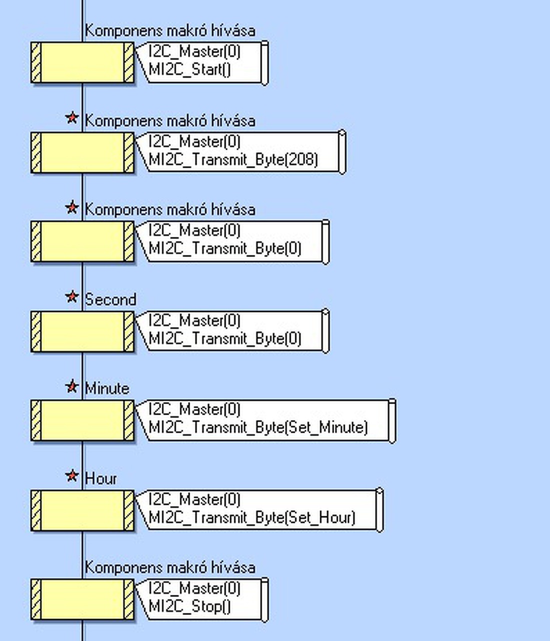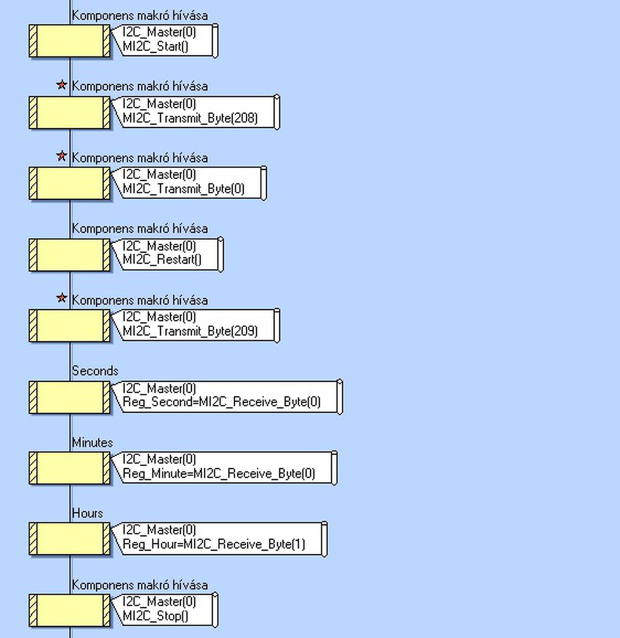 Alapinfó, hogy a DS1307-es IC címe 1101 000. Ez csak hét bit, a nyolcadik határozza meg, hogy írni vagy olvasni akarsz az IC-be/ből. Íráskor 1101 0000 (decimálisan 208) kell, olvasáskor 1101 0001 (decimálisan 209). Az egyszerűség kedvéért a makrókban is a decimális számok szerepelnek. Kezdjük az írással (az idő beállításával), az egyszerűbb. 1: Az I2C kapcsolat indítása. 2: 208 kiküldése (az IC megszólítása, írás üzemmód). 3: Az IC-nek meg kell mondani, hogy melyik memóraterületre állítsa be a regisztermutatót. Jelen esetben a másodperceket akarod beállítani ami a nulladik regiszter. 4: 0. regiszterbe nullát írsz. 5: 1. regiszterbe (perc) beírod a beállítani kívánt percet. 6: 2. regiszterbe (óra) beírod a beállítani kívánt órát. 7: Az I2C kapcsolat leállítása. A dolgot kicsit bonyolítja pár dolog. Az első lépés, legalábbis ennél az IC-nél az, hogy meg kell neki mondani, melyik regiszterrel akarsz foglalkozni. A 0. regiszter tartalmazza a CH bitet is. Ha az egy, akkor az óra áll. Az időt és a dátumot BCD formátumban kell megadni az IC-nek. Az IC automatikusan növeli regisztermutatót (olvasások és íráskor is), azt nem kell külön növelned. Magyarán, ha írsz a 10. regiszterbe, akkor a következő írás automatikusan a 11. regiszterbe fog íródni. 3. ikon: nem kötelező a nulladik regiszterrel kezdeni. Ha csak a dátumot akarod beállítani, akkor a harmadik ikonnál 3-at kell megadni. Az adatlapi regisztertáblázatban megadott címek hexadecimális formátumúak, azokat tetszés szerint át lehet váltani más számrendszerbe vagy eleve úgy használni Flowcode-ban: 155 = 0b10011011 = 0x9B Olvasás: 1: Az I2C kapcsolat indítása. 2: 208 kiküldése (az IC megszólítása, írás üzemmód). 3: Regisztermutató nullára állítása, mert kíváncsi vagy a másodpercekre is (már ha valóban itt akarod kezdeni). 4: Az I2C újraindítása. 5: 209 kiküldése (az IC megszólítása, olvasás üzemmód). 6: Másodperc kiolvasása (0. regiszter, az olvasás után a regisztermutató automatikusan ugrik egyet). 7: Perc kiolvasása. 8: Óra kiolvasása. * 9: Az I2C kapcsolat leállítása. * Olvasáskor a makrónak meg kell adni, hogy az adott olvasás az utolsó-e vagy lesz még több is. Ha az utolsó, akkor az adott értéket 1-re kell állítani. 6. és 7. makrónál nulla, a 8. makrónál ez az érték 1, jelen példában.