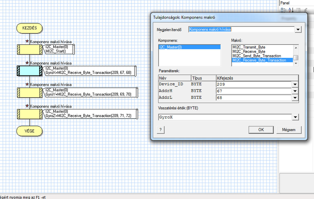 De ugy látom hogy I2C-n belül is el kell különíteni azokat az ezközöket amik csak adatot küldenek illetve azokat amik küldenek és fogadnak is! Jelen esetben amire gondolok... Van itthon egy MPU6050 modulom, erre gondolom én értelemszerűen nem tudok irni, bár hogy nézegetem az adatlapját /igaz az angolom elég pocsék/ de ugy látom hogy "'az érzékenységet" én választom meg.... hogy azt hogy, azt még nem tudom! De akkor ha én egy MPU6050-es modultol akarom lekérni az adatokat akkor - Elindítom Start al az I2C-t - Megszólítom a perifériát / adatlapja szerint ennek is a címe 1101000 mivel olvasok ezért 11010001 azaz 209 - Utánna Pedig és itt jön a pedig.. Mivel nem tudom értelmezni az adatlapot kicsit meg vagyok lőve! Azt irja hogy a visszatérési értéket int-be mentsem ha jol olvasom. Ok csináltam is 3 változot Xaxy Yaxy Zaxy int kategóriába. olvasásos megszólitás után hivok mégegy MI2C_Receive_Byte komponens makrót adom neki hogy Byte 0 visszatérési érték ( mert ha jol tudom oda menti a bejövőt) Xaxy?? Utánna végigpötyögöm ugyan ezt Yaxy-ra meg Zaxy-ra plussz 3 másik változóval x-y-z gfyorsulásra, annyi különbséggel hogy a legutolsónál 0 helyett 1 Byte? Vagy hogy címzem azt hogy honnan olvassa? Helyesebben hogy az X axysnnál az X axyst kérdezze, vagy ez automatikus?? és lépeget egymás után? én csak kérdezgessem az adatokat? Vagy nagyon nagy nagy marhaságot írtam?