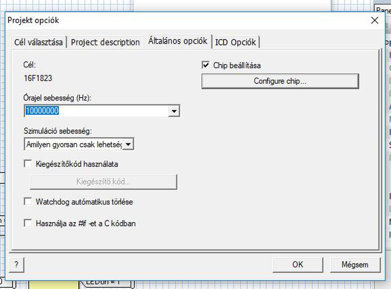 Az adatlapból nézd meg, hogy a belső oszcillátor milyen frekvenciákon tud ketyegni. Ezután válassz egyet, állítsd be az osccon regiszterrel (Bővebben: Link) maj ezt az értéket add meg a Chip beállításaiban.