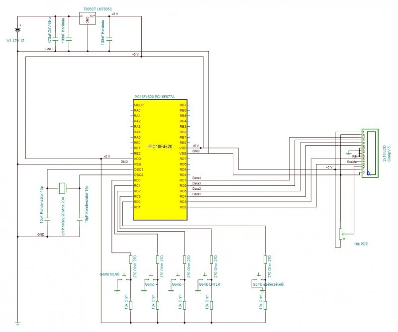 azt hittem tényleg valami ufó által itt felejtett LED-et találtam...De csak a rajz volt pontatlan...A gomb beállítása megtette hatását.. Végre működik . Köszönöm a segítségeteket és ugye nem haragszotok nagyon ha továbbra is zaklatlak titeket a bugyuta kérdéseimmel... De miért van az hogy ha beteszek egy 10k ellenállást a +5V és a PIC 1-es lába közé akkor a LED villog és nem folyamatosan világít? Paradicsom-nevelde projekt folytatódik ... LCD kétsoros panel illesztése ![]() Szerk : .ne üsd az entert feleslegesen .