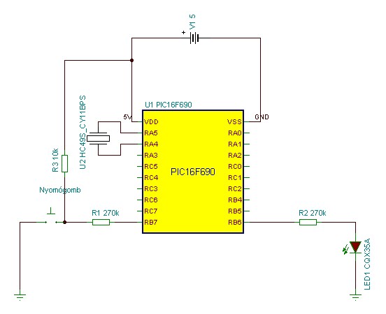 Kotortam a teszthez egy másik PIC-et. A rajz szerint bekötöttem rá egy gombot és egy led-et. Működik de a led nem lenyomáskor világít hanem amikor nincs a nyomógomb zárva... Kész, mattot kaptam... A flowcode rontja el vagy a kapcsolás rossz? Ha a gombot a javasolt link alapján rakom össze akkor a táp 7805-je izzani kezd a 7805 ... link