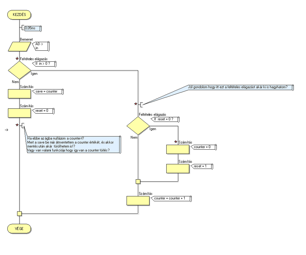 Megnéztem mind a két programot vannak mind a kettőbe "elemek" amik nagyon tetszenek! Én a "jelszint tisztázására" nem is gondoltam, pedig hasznos lehet mert egy késleltetés után nem biztos hogy pont a ciklus "üres részén" fog belépni a program... és így elkerülhető a hibás számítás. mondjuk ha meg kokozo verzióját nézem akkor meg nem kell a "ciklus kezdését megvárni" hiszen tápadás után folyamatosan követi az értéket. kokozo csatolok egy képet belekommenteltem a programba.. Ha nem látszik jól a komment Jól gondolom hogy azt a feltételes elágot akár ki is hagyhatom? Ha az első ágba nullázom a counter-t? Mert a save be már átmentettem a counter értékét, és akkor mentés után akár törölhetem is!? Vagy van valami funkciója hogy igy van a counter törlés? A hozzászólás módosítva: Júl 7, 2020