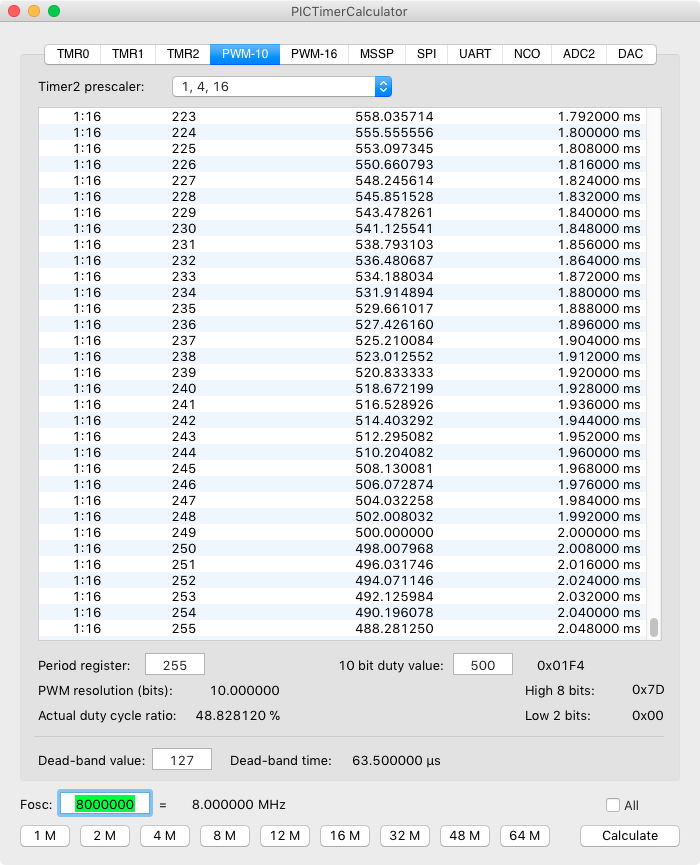 A felbontás akkor a legnagyobb, illetve a PWM frekvenciája akkor a legkisebb, amikor a PR2 értéke a lehető legnagyobb, ez 255 nevezett PIC esetén. A Flowcode-ban 256-ot is be lehet állítani, de igazábol a háttérben ebből mindig levon 1-et. Ha nem valami extra dolog, akkor 1:16 előosztó mellett állíts be 256-ot periódus regiszter gyanánt. A táblázatban 8 MHz-es órajel mellett láthatóak az értékek.