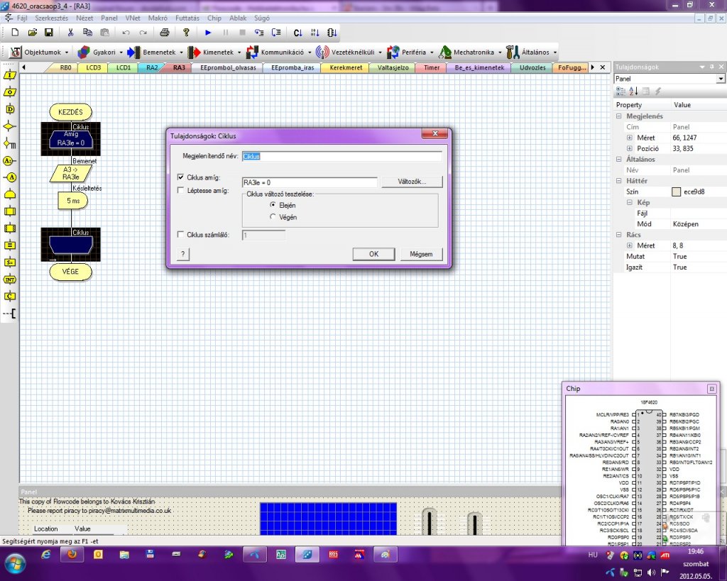 De leírom a logikáját, az alapján szerintem tudsz csinálni hamar egyet. (képet tudok küldeni párat most) Elsőként írd le magadnak mit tudjon a menü. Melyik oldalon mit írjon ki. Ez után minden oldalhoz csinálj egy makrót, PL.: 1_old, 2_old, 3_old... stb.. Ezekbe rendesen mint mikor kiíratsz valamit megcsinálod az LCDre való kiírást. Mintha csak 2 sort írna ki simán. Csak minden oldalra azt íratod ki amit kitaláltál. Így meg lesznek az oldalak. Ez után készítesz egy változót pl. "lapozas" nevűt. Gondolom tudsz pergés mentes gombot csinálni. Ha fel - le akarsz lapozni akkor kettő gomb kell. A gombokat külön-külön teheted makróba és akkor elég csak a makróját megívni. (Valahogy így: le gomb. jpg-t nézd meg) Ez után jön, hogy mit tegyen a gomb, vagyis feltételes elágazások. - Ha a "fel" gombot megnyomod akkor "lapozas = lapozas +1" - Ha a "le" gombot megnyomnod akkor "lapozas = lapozas - 1" (navigal.jpg) Itt látod is, hogy a gombok makrója meg van hívva és nem kell mindenhol újra megírni neki a programrészletet. (nálam 6 gomb vezérel, mert kettő lapoz jobbra-balra és a másik néggyel a menün belül lehet állítani az órának az adatait. A jobbra-balra gombnak megmaradt nálam a "setup" és az "ok" neve, mert az elején csak 4 gomb volt és ezekkel lehetett menteni epromba és setup menübe bemenni külön) A fő programban pedig egy több irányú elágazást teszel aminek a változója a "lapozas" és az értékek 1,2,3,4..... amennyi oldal van, és plusz egy aminek a sorába a Felteteles1.jpg is léáthatod, hogy van egy "lapozas=1" nevü kocka, ami arra szolgál, hogy ha az utolsó oldalt túlléped akkor az elsőre ugrik. A Navigalas.jpg alján pedig ennek a fordítottja van így ha az első oldal fölé mennél akkor az utolsóra ugrik) Majd az elágazásokba be teszed az oldalak makróját. (lásd nálam az LCD1, LCD2 stb makró) Így amelyik értékkel egyenlő lesz a "lapozas" valtozód az az oldal makrója vagyis azt az LCD kiíras sort fogja futtatni addig amíg el nem nyomod másik oldalra. (Én sok makrót használok, hogy áttekinthető legyen. Minden gombnak külön makrója van. Minden LCDre kiírásnak stb... Így a programot hamar át tudom variálni)