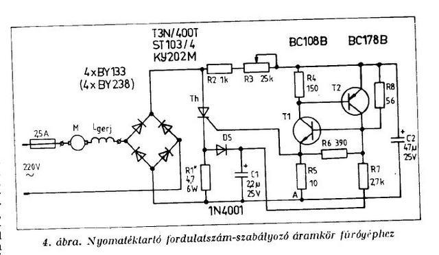 A kapcsolás 2 db 4.7k nagyobb teljesítményű ellenállásból, teljesítmény tirisztor és talán 1 tranzisztor? Műköves barátomnak csináltam a vizes csiszolójához is. Jó működött, míg ki nem próbálta egy egyfázisú asszinkron motorral is...
