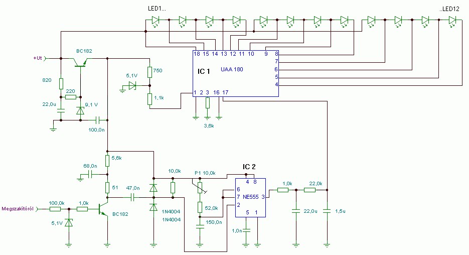 De van egy hiba is a rajzon. Úgy látszik, hogy az IC 1-es lába 5.1V-ot is és testet is kap (az 1-es láb egyébként test). Amúgy elhagyható az az 5.1V-os zener, 750ohm, 1.1k. Működik azok nélkül is. Sőt, az egész 9.1V-ot előállító rész sem kell. Helyette nyugodtan lehet használni 7810-et (a LED-eknek viszont változatlanul 12V kell). Nekem is így van megoldva a 40 LED-es, UAA180-as mérőmben. Üdv Krisz Ui: a pdf-et nem tudom megnyitni...