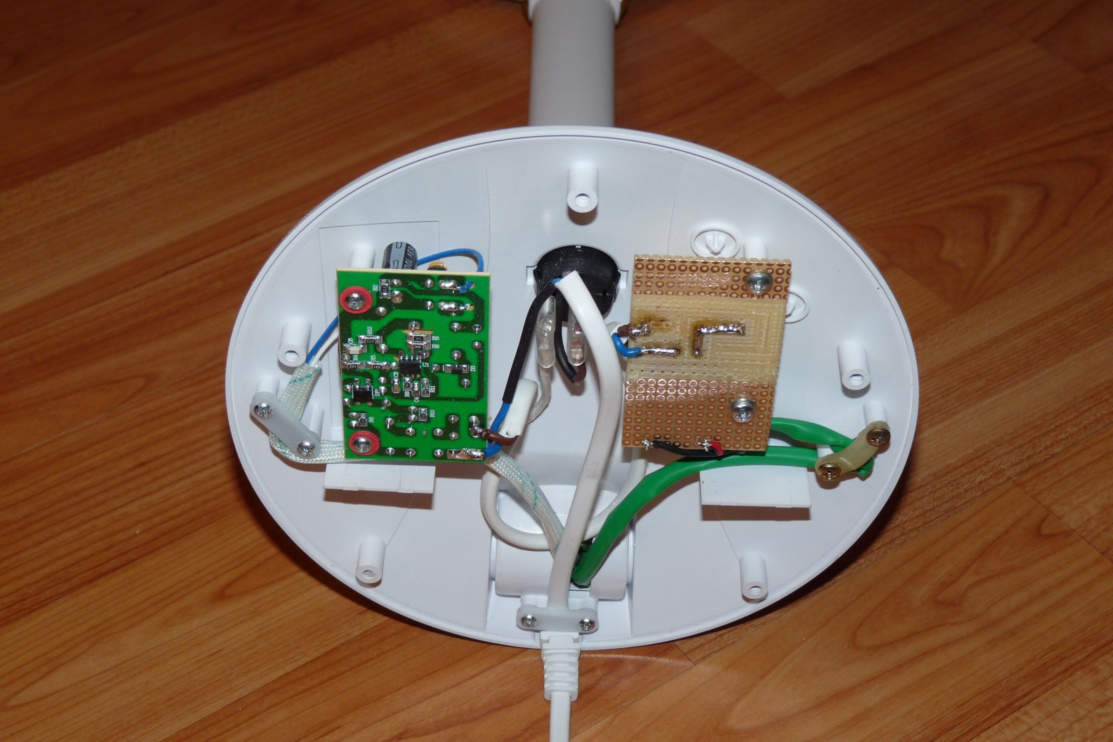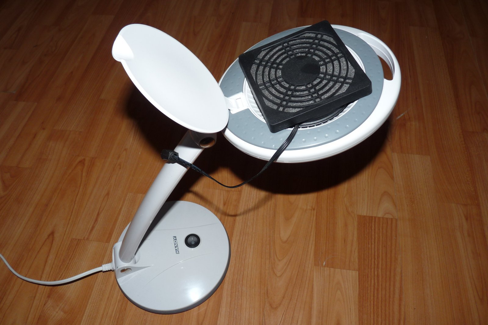 Handy LED-es nagyítós lámpa, amihez a 100mm átmérőjű lencse külön rendelhető, nem tartozék, nem is kell megvenni. A lencse helyére a lencsét rögzítő gyűrűbe pont beleillik a 92mm-es kör ventilátor. Pont belemegy, annyira szorosan, hogy nem is esik ki. A ventilátor egy Cooler Master processzor hűtőről van, de sok hasonlót lehet kapni. Erre került egy 92mm-es porvédő, amit számítástechnikai boltokban lehet venni. Amibe pedig a szokásos szén szűrő szivacs megy. A lámpa talpában pedig egy Hi-Link HLK PM-12 adja a tápot egy biztosíték társaságában egy próbanyákon. Szerencsére egy második táp felfogatása szintén megvolt a talpban, így a rögzítés is oké. A 12V-ot pedig felvezettem a lámpa szárán egy jack aljzatba, így a ventilátor egy mozdulattal eltávolítható, és máris visszakapom az eredeti nagyító funkciót, ha akarom (bár nem akarom).