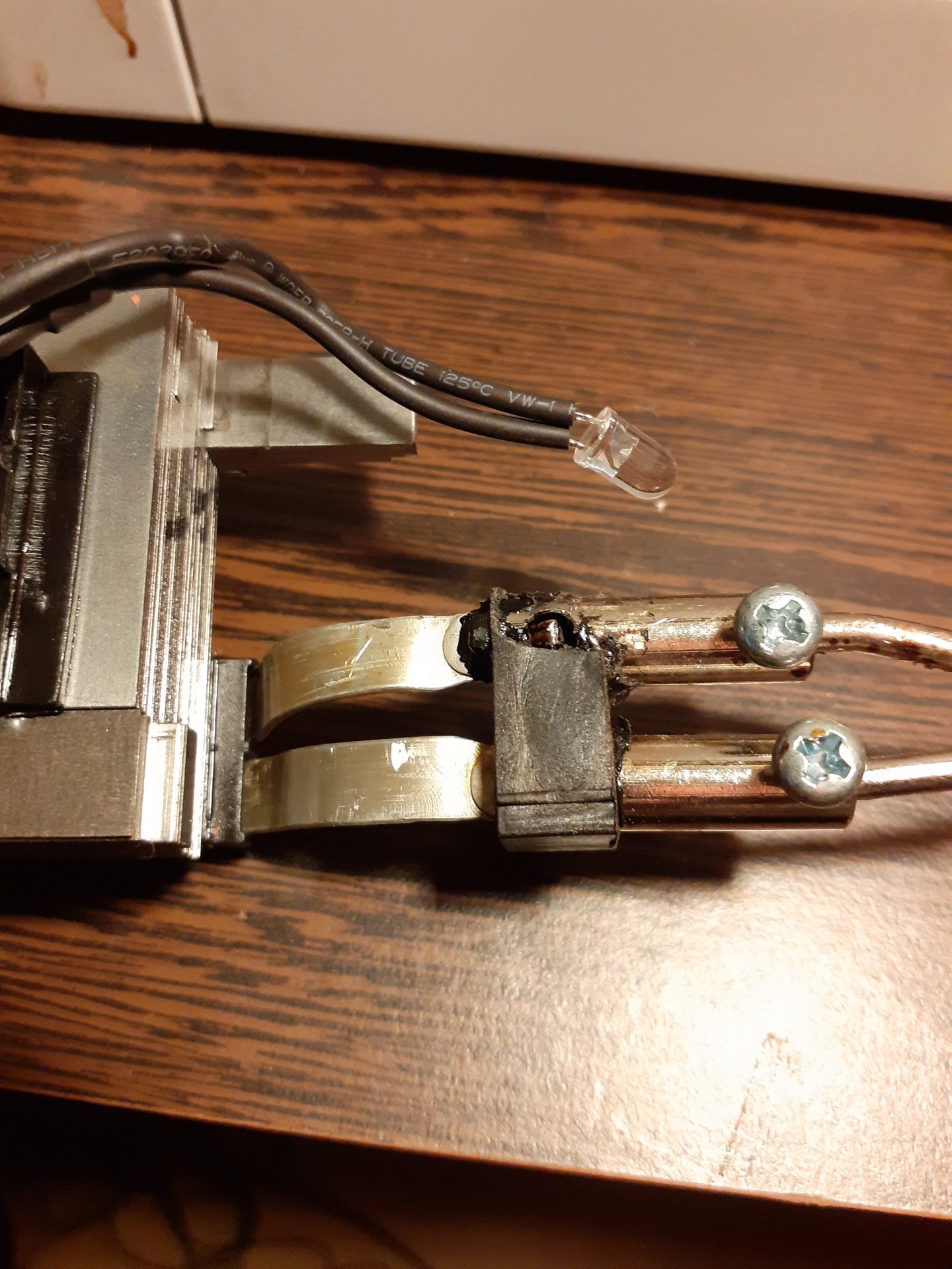 Nem huzal, hanem csak lemez. Próbálom nagyobb sérülés nélkül levenni az olvadt műanyag elemet és utána hevíteni az illesztési hézagot és kitölteni forrasztó anyaggal. Ha el megoldás lenne ebben az estben is. Na meg a lemezek is el tudnak mozdulni mert nincsenek csavarral összefogva. Zúg is mint egy kompresszor.
