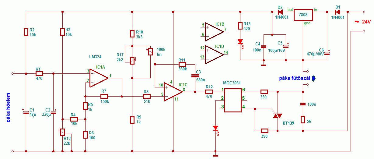 Karácsonykor megépítettem az Attila86 féle forrasztóállomást. Működött is korrektül, egészen máig. Egyik napról a másikra hírtelen eltűnt belőle a pákafűtés. A hőmérő stabil 23°C-t mutat, a fűtést jelző led világít, de a páka csak nem akar melegedni. A trafóból kijön a 24V-t, be is jut az áramkörbe, de a pákáig már nem jut el. A fűtőszál nem szakadt, ki mértem. Ezekből úgy gondolom hogy a MOC3062 dobta fel a talpát. Jól gondolom, vagy máshol keressem a problémát?