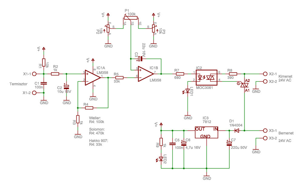 Más is tapasztalt olyat, hogy a Vzoole-féle univerzális vezérlővel alsó végállásban borzasztóan nagy a hiszterézis (~100°C)? A poti másik végénél szépen tartja a maximális beállított hőmérsékletet. A páka Hakko 907 clone. A nyákot végig ellenőriztem, nagyon ronda lett az alul-méretezett forrszemek, és kopott 0.8-as fúróm miatt, de szakadást nem találtam sehol. Ellenállások, kondik mind a kapcsolás szerintiek..