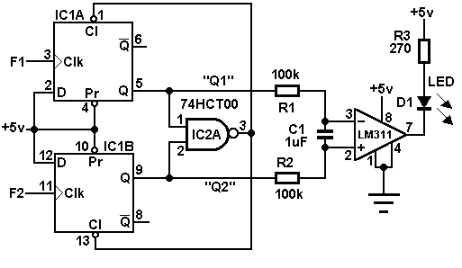 csinálj egy négyszögjel generátort (0V és -5V) és annak a jelét összegzed a másikkal és ha 0V akkor azonos a freki... persze ehhez az kell, hogy a vizsgálandó jel indítsa a négyszögjel generátor hogy szinkronba legyen.