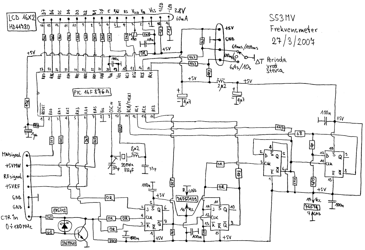 Az inkább csak 30MHz-től éled fel. Ki kellene egészíteni egy hagyományos (30MHz alatti) bemenettel is, de lehet hogy az nem is olyan egyszerű, mert alapból 64-es osztás van, a program is ahhoz van írva. Plusz a bemeneten nincs semmi csak két dióda, mi van ha mondjuk 10-20V-os jelet kell mérned? Akkor azok ott füstölni fognak. Ami nekem van azzal ha jól emlékszem még a 60V-os kapcsolóüzemű táp szekunderét is meg tudom közvetlenül mérni. Ha már ilyet épít az ember akkor annak legyen normális bemenő fokozata, az meg olyan, hogy feldolgozza a jelet már mondjuk úgy 20-50mV-tól, de nem ijed meg az 50V-tól sem, ha éppen akkorát kell mérni.