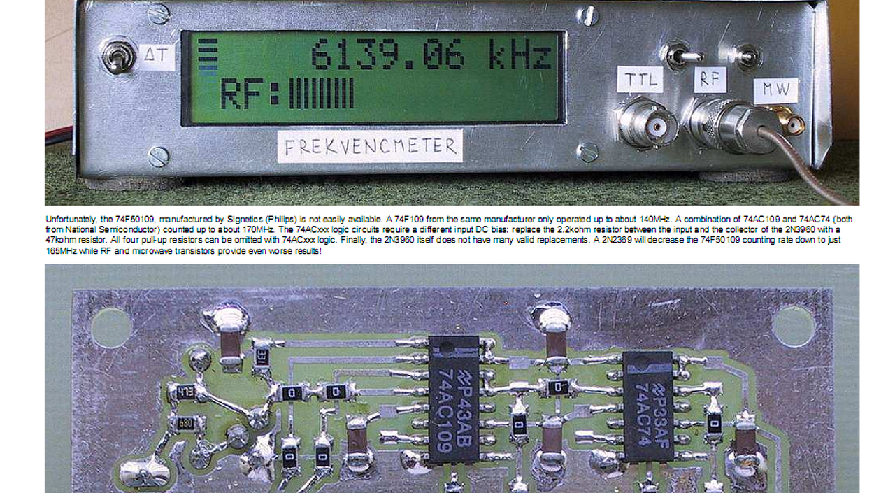Az alkatrészeket meg sajnos jobb forrás híján ebayról szeretem be segítséggel. Az eredeti leírásban van szó módosításokról, jobb IC, a proci mellet, meg kitér pár apróságra. Ennek az egésznek egy baja van, hogy pontosan azok kellenek bele mint ír hozzá. Akkor lesz garantált a működés. Sajnos kritikus a procinál lévő bemenőfokozat a dióda és a tranyó, erről is ír. A nagyfrekis elosztóra gondoltál, akkor lehet mást tenni bele, csak az osztása jó legyen, legfeljebb kevesebbet tud majd. Modulárisnak mondható ezen része... Csatolni sajnos nem tudom az eredeti lementett leírást, mert túl nagy, de idevágó részletét igen: