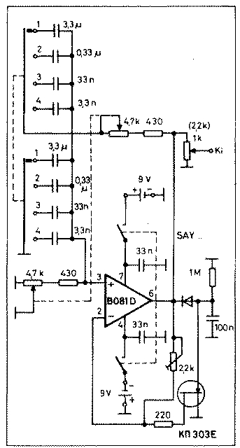 Hello, itt a tesója, ehhez nem kell forgó, de már későn szólok ugye? Szerintem jobb ellenállással hangolni, hosszabb az útja, lehet digitalizálni is. Bár meglehet, hogy kettős forgókondit könnyebb beszerezni, mint kettős potit. Szerintem kényes ez a kapcsolás, mert oké, hogy FET, de 20Hz mellé 500pF!!! Elég extrém!! Elég egy kis pára s mindjárt mászik az egész. Szerintem nagyobb áramokkal jobb lenne egy ilyen kapcsolás. (Milyen lenne ezt varicapokkal megoldani??)
