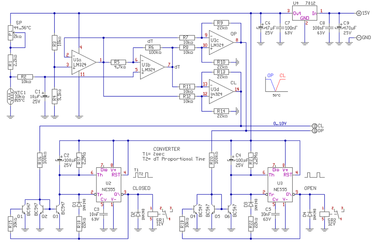 Igen, valami ilyesmire gondoltam, viszont jó lenne, ha be lehetne potikkal állítani a kikapcsolási és bekapcsolási hőmérsékleteket. Vagy hiszterézist 1 potival. Gondolom a hőmérsékletet az "SP" potival lehet beállítani. Max 8k hiszterézis elég lenne. Pl. ha beállítom 50 fokra, akkor 46-nál open 50 fokig, 54-nél close 50 fokig. Szóval ha így működik a kapcsolás, akkor jó.