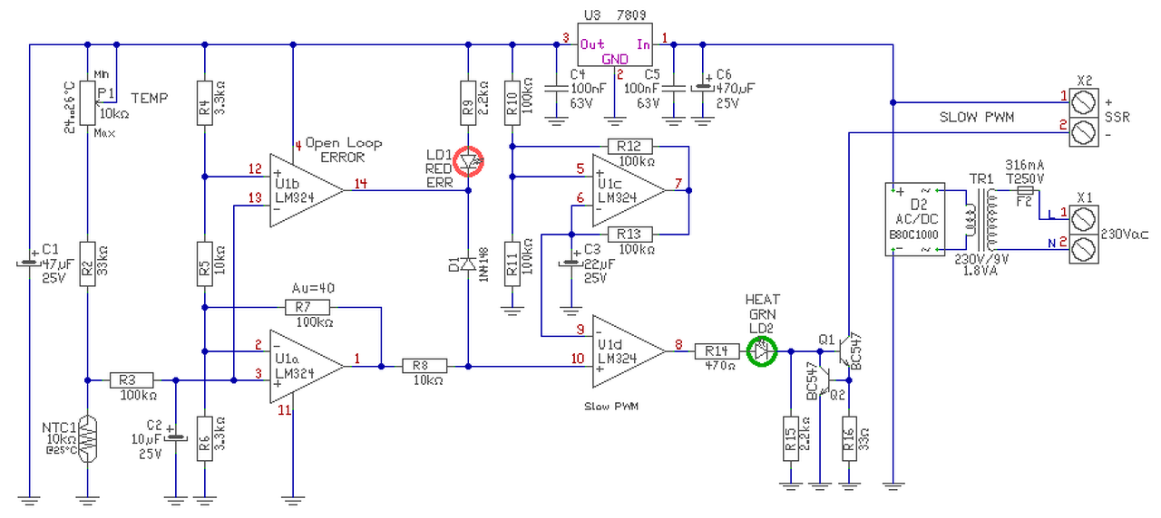 Az érzékelő egy mezei 10kohm-os NTC. Azt kell megfelelő helyre elhelyezni. De természetesen ezzel kísérletezni kell. Kimenetére rákötheted az SSR-t, akár párhuzamosan, akár sorba. Az SSR bekapcsolt állapotát egy zöld Led jelzi, egy piros pedig, ha a mérőkör hurok megszakadna. Akkor letiltja a működést, mert ebben az esetben állandóan fűtene a fűtőtest. Az R2 értékét esetleg változtatni kell, ha az NTC között eltérés van, vagy más hőmérséklet tartományt szeretnél beállítani. Az R7 értékével, az arányos szabályozási tartományt lehet beállítani. A hozzászólás módosítva: Máj 5, 2016