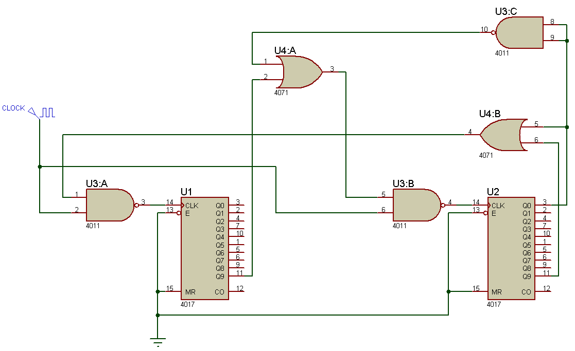 A rajz 18 ledes futófényt mutat, két számlálót két VAGY-kapu, és három NAND-kapu köt össze (ebből az egyik, mint inverter dolgozik). Ha az első végigszámolt, le lesz tiltva az órajelénél a változás, a másodiknál meg fordítva, akkor lesz engedélyezve; ha a második is végigér, kezdődik elölről. Azért írtam 18 ledeset, mert a számlálókon a Q0 kimenetet nem tudjuk így villogásra használni, az elsőé állandóan aktív lesz, míg a második számol, és fordítva. A Q1 ... Q9 kimenetek és a ledek közé illik valami meghajtó, ez nincs a rajzon, sem az órajel-generátor, na meg az IC-k táplábai sem, ezek értelemszerűen ott vannak a helyükön