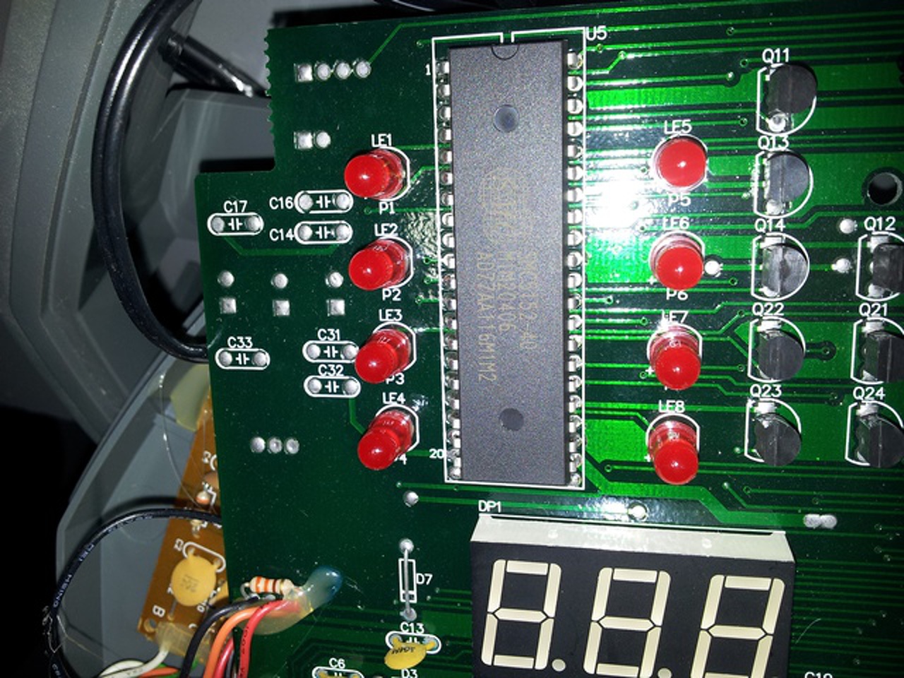 Hát elég nagy katyvasz van a felső panelon, de mint láthatod, azt is pic vezérli. Egyrészt a kijelzőket, másrészt a gombok mátrixát értelmezi, és 1 soros vonalon küldi le a vezérlőnek. Külün tápja van, s galvanikusan az 1db optoval van leválasztva. Mivel szkópod nincs, DMM-el kellene az opto lábára mérni, hogy változik-e a fesz. Mivel impulzus-sorozat, kb fél tápfesznek kellene lenni, a kitöltés függvényében. Elméletileg a PIC adja a bekapcsolási jelet is.... Keresd meg, hogy a start gomb hova megy, illetve a Q27 bázisa, honnan kap vezérlést.