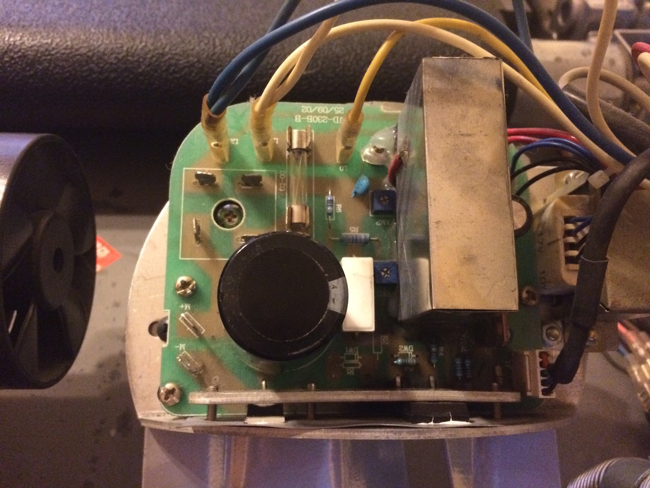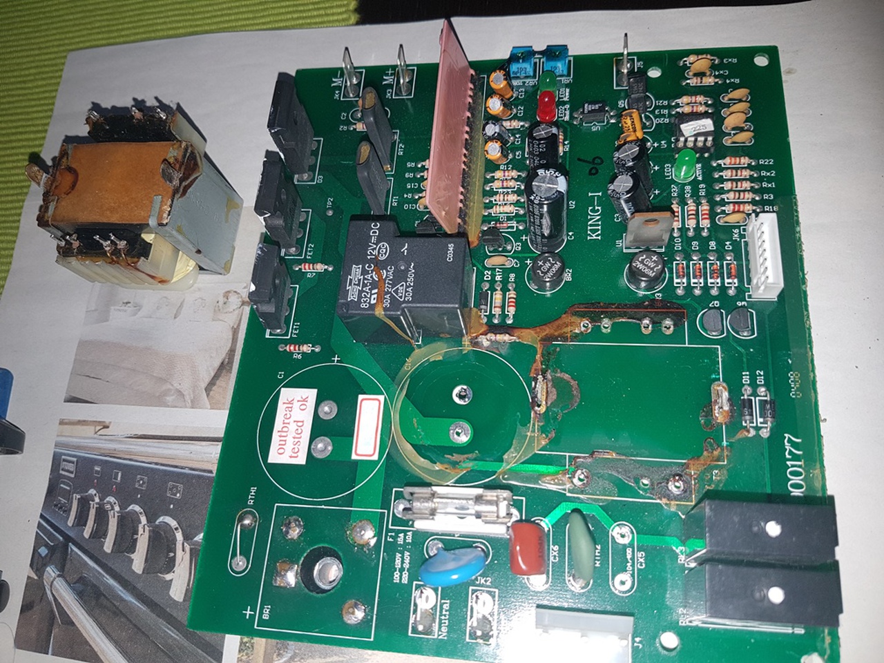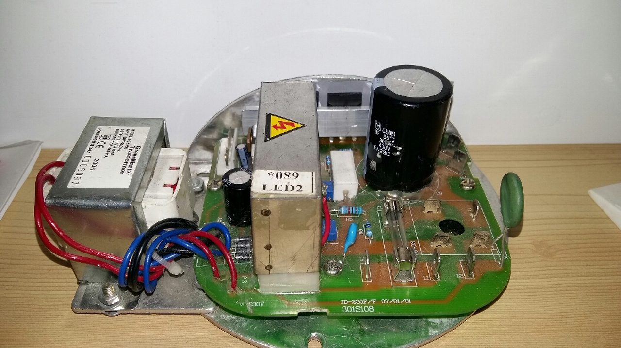 Sziasztok, újra itt vagyok. A következő történt a vezérléssel. Bekapcsoltam a futógépet, hogy a kijelző panelen mérjek. A lenti panel a parkettán volt. Nem ért semmi fémhez, nem látszott víz sem. Áram alá helyezéskor már szikrázott egyszer, majd a következő áram alá helyezéskor csattant is ugyanott egy nagy villanás kíséretében. A képen látszik, hogy ragasztó, vagy gyanta fogta a nagyobb alkatrészeket. Ez a ragasztó gondolom idővel a melegtől elkezdett szenesedi. Valószínűleg ezen lecsapódott a pára, és ott zárt rövidre. Nem látok rajta sérülést ott, ahol szikrázott. És máshol sem. Viszont kivettem a trafót, relét, nagy kondit, hogy levakarjam az égett ragasztót. A nagy kondi 470 mikrós gyárilag, viszont mérve csak 430, és ESR mérővel sem mutat jó értéket. Szóval cserés, plusz van ott egy ellenállás, lehet, hogy mégis az kapott egyet a szikrázáskor. Talán sárga-lila-sárga-arany van rajta, az első szín alig látszik. De anélkül is, hogy ezt tudnánk, ez nx100K-s tartomány, nekem pedig megás tartományban ugrált a műszer. Szóval ez is cserés, de az első színt passzolom. Egy hét múlva megyek haza, akkor megveszem hozzá a kondit, meg egy 470K-s ellenállást. Az ellenállás párhuzamos a 470 mikrós kondival. Ezen kívűl a nyomógombok sem reagáltak túl jól a zárlatkeresővel mérésre. Bár a gépet bekapcsolva a kijelzőn reagáltak. Az optót nem tudtam még megmérni, mert ugye kondi, ellenállás nincs a helyén. A Q27 bázisa ellenállások hadán át megy szerteszét, de majd átrajzolom egy lapra, és felteszem ide. Ugyanígy a start gombbal is. Még annyi, hogy mivel UK-ben élek, lehetséges a páralecsapódás a panelen, főleg mostanában végig esett is. üdv, hegusp