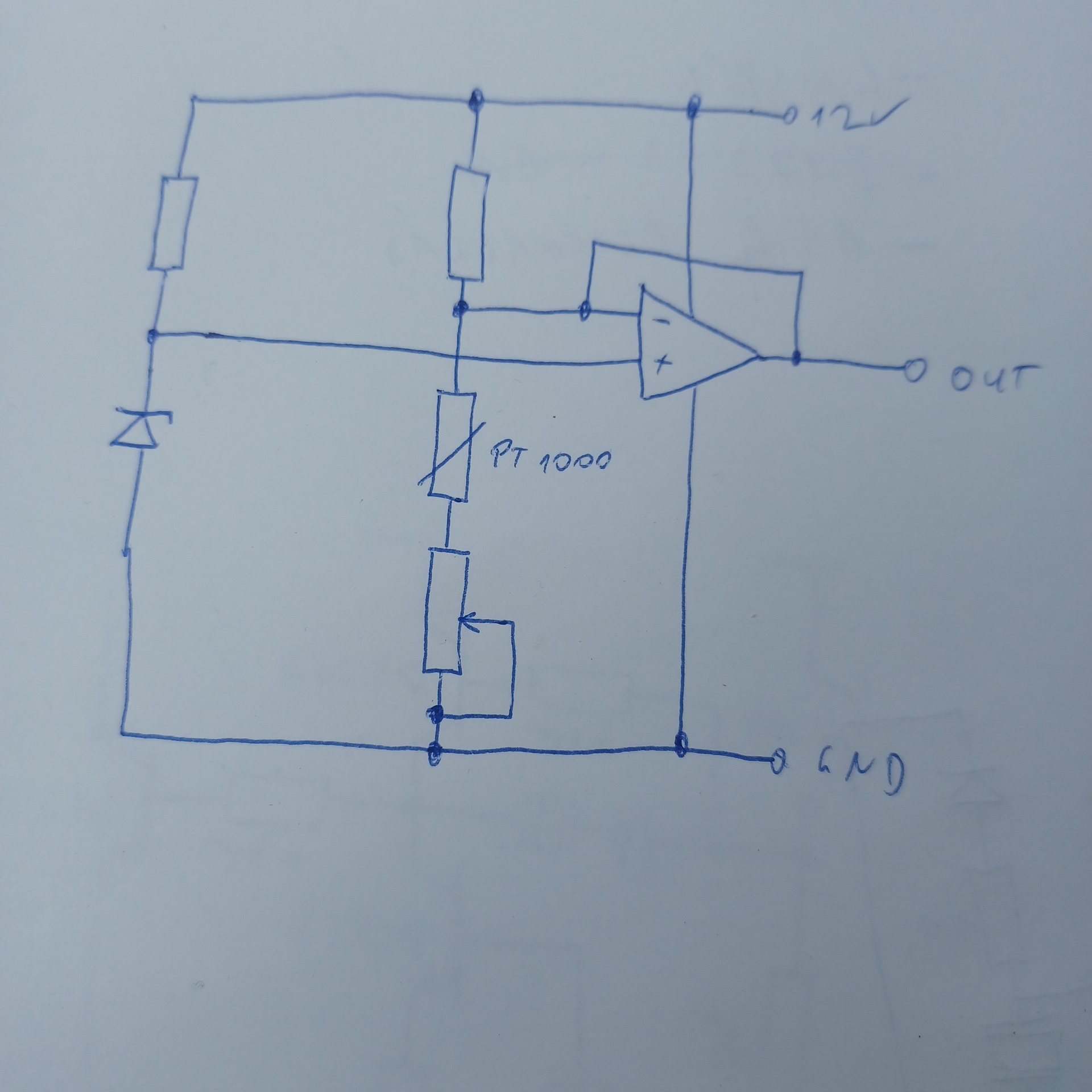 - A műveleti erősítőt Te 100%-ban visszacsatoltad. Így abból egy "követő" kapcsolás lett. Vagy is követi a neminvertáló bemenetét. Mivel ott a zéner feszültsége van, a kimeneten is a zéner feszültsége lesz, bármit tesz is a Platina és a poti. - Ez egy híd-kapcsolás lenne. Ami ha ki van egyenlítve, a kimeneti fesz nem változik. De a híd kiegyenlítését a felső tagnál célszerű megoldani, nem az érzékelővel sorba. Mert ha a poti rövidre van zárva, akkor a Pt. %-os változása megjelenik a hídátlóban. De ha a poti mondjuk 1k-n áll, akkor a Pt változásának csak a fele fog hatni. - Értelmetlen a hídban zénert alkalmazni. Mert a híd másik fele a tápról megy. Ha a táp megváltozik, akkor ez a különbség megjelenik a hídátlóban. Pedig semmi nem változott az érzékelésnél. Vagy is ha a zéner helyett egy ellenállást alkalmazol, akkor egy kiegyenlített híd esetén (vagy is keresztágak szorzata egyenlő), a híd kimenete nulla. A táp hiába változik meg. (Ha a híd kiegyenlítetlen, akkor a hídtáp változása, csak a kiegyenlítettség mértékére fog hatni.)