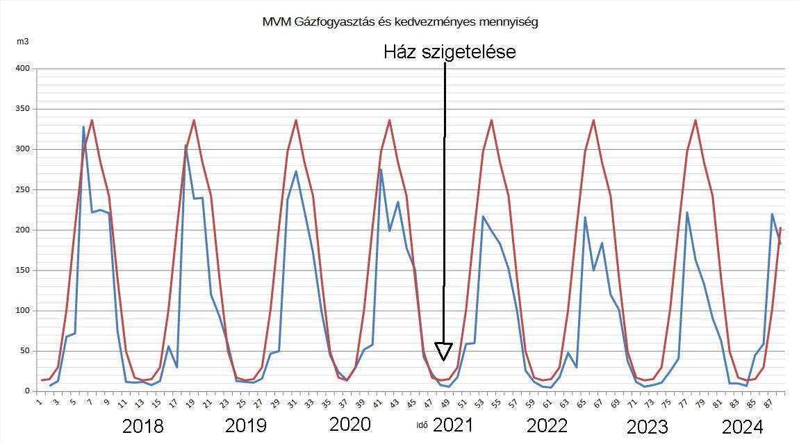 A piros görbe a kedvezményes limit. Elég jól hoztuk már szigetelés nélkül is.