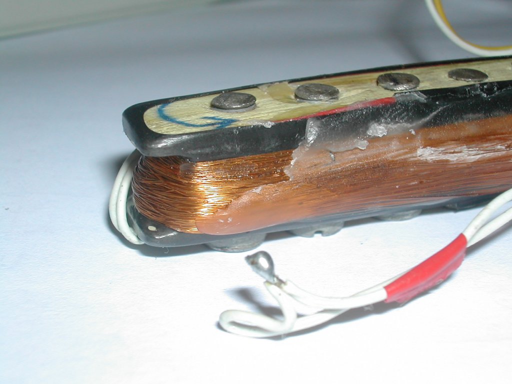 Mágnes, vasmag, drót. Az egész igen ronda, mert eleve kísérletezésre készült. Viszonylag tutira mehetsz vékony lágyvasmag lemezzel, tekerj rá cellukszot, mert ha a lakk lepattanik a drótról, érintkezik a maggal, az nem jó. Végigéri a hat húrt, nem kell a távolsággal bíbelődni, elég nagy a térerő a keskeny lemez miatt, nem kell túl nagy menetszám, és mégis nagy jeled lesz, és jól hozza a felhangokat. Na most ha 3 húr alatt van egy Északi polaritású, a másik 3 alatt meg Déli máges, a tekercseket ellentétes irányban tekered-kötöd be, akkor a jel összeadódik, a brumm, zaj meg kioltódik, és kész a zajmentes single coil. Ha végigrakod a nyaktól a hídig hangszedővel, és külön kapcsolhatók, akkor lesz nyaki-hídi humbuckered is, ha kell. Gibson, strato, tele hang, amit akarsz. Ha mazochista, tekersz külön minden húr alá és külön vezeted ki (egér csatlakozóján kijön 6 szál), külön torzítót kapnak, na az hanyattver.