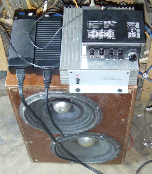 Tulajdonkeppen majd 8 Ohmon fogom hasznalni hidba hogy kb 70W -ot kiadjon . Ha bevalik ( marmint a laptop tapegyseg ) jo lenne mert konnyu 70W-os cucc . Jo lenne eladni a hagyomanyos hanszoroimat es neodinium -os konnyu nagy SPL-es -eket venni . Uj jatekot vettem JammanStereo Loop Machine ...na most az a baj hogy sztereo szelessavu erositio es jo hangszorok kellenek ..de konnyu es kicsi ..es basszust is vigyek hogy a dobgep -nagydob is szoljon .Persze csak neha kell ha valahol nincs megfelelo cucc igy egy megent plusz befektetes.dehat a hobby az hobby. Itt egy kep a proba osszeallitasrol .Meg nem probaltam ki a Celestion -okat 8 Ohm-ra kotve hidba erositovel osszehasonlitani a masik Sony aotuserosito+Blue Marvel hangszoros cuccommal ami jol szol .Hangsozabb lessz e vagy nem. A kis autos eloerosito-hangszin stb egy kis kapcsolouzemu taprol megy kulon 12V-rol.Most radio megy rajta ..semmi zavar eggyik tapegysegtol se ..a radiot ratettem a tapegysegekre es semmi zavar .Igy gondolom majd a "high gain" torzitoba se fog bevinni zajt.Kulonben az uj Zoom Multiprocesszorom gyarilag kapcsolouzemu tappal jott es semmi zavar.