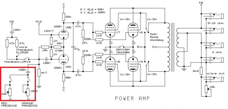 A végfokozatban levő prezenc máshogy működik,mint az előfokozaté. Az előfokozaté vágja a magasat, tompít, míg ez a vég átfogó visszacsatolásába avatkozik be. Azt szabályozza, hogy magas frekvenciákon mennyire fogja vissza a hangszórót a végfokozat. Más más a hatás. Próbáld ki, semmibe nem kerül, amelyik tetszik, azt meg bennhagyod...A 4,7k kéne, egyrészt, hogy egyáltalán működjön a fázisfordító, másrészt a 47k-k vele képezik a visszacsatolást a kimenő szekunderéről...Ezt söntöli a 100nF+100k/22k.